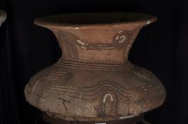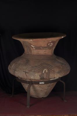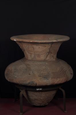 | Description / विवरण | A storage jar with wide flaring mouth, rounded rim, bluging body and elongated base tapering into a narrow flat bottom. It has a very complex design in applique consisting of a human-headed panther flanked volutes fond of four concentric bands; on the exterior of th rim there is double arch crowned by a triple band ending in volutes. |