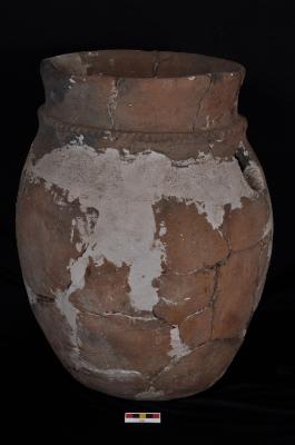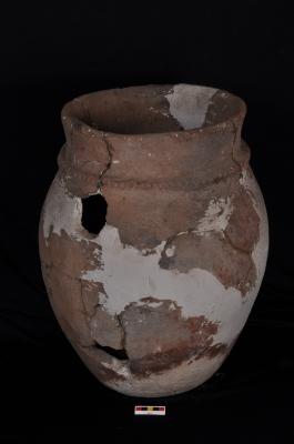 | Description / विवरण | A huge storage jar flaring out rim, flat base. It is decorated with an applique band on the neck having finger-tip impression. |