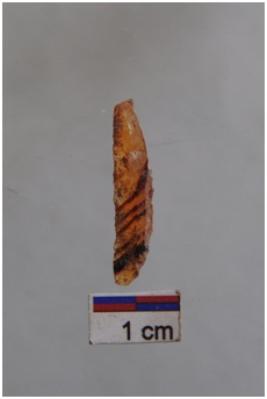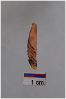 | Description / विवरण | Blade, with one straight and another convex working edge, diffused bulb with striking platform at proximal end, retouches on both working edges. |
