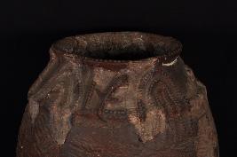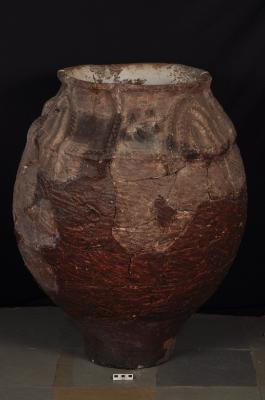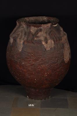 | Description / विवरण | A large storage jar with convex profile, wide mouth with outturned rim. It has flat pedestalled base. The outer surface of the jar consist of applique designs in the form of lizard, turtle, mother goddess and semi circular arches. |