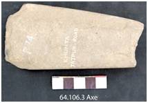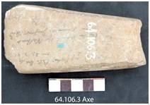 Fully ground retaining a longitudinal fracture on the ventral. Ventral face is convex, dorsal is flat and beveled at the edge. Edge line is convex showing marks of battering. Margins are ground, flat and rectangular in cross section.