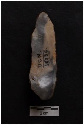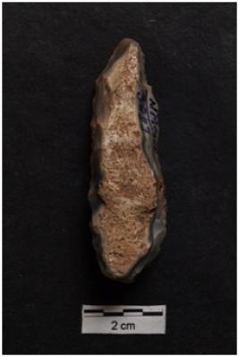 | Description / विवरण | Long Flake, prominent bulb on ventral surface, cortex visible on dorsal surface. |