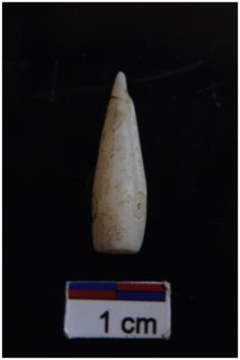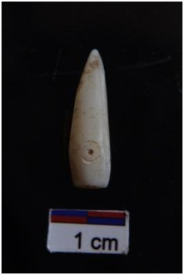 | Description / विवरण | Tooth Pendent, slightly caved, tapering top flat and truncated, on surface dots possibly for inlay bread wise perforation eye amulet. |
