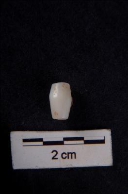 | Description / विवरण | Bi-conical shaped shell bead, circular cross-section, smooth polished surface, with perforation. |