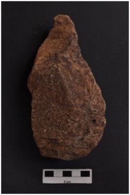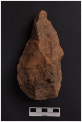 | Description / विवरण | Handaxe, bifacial, pointed distal end, retouches along the periphery. |