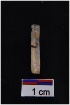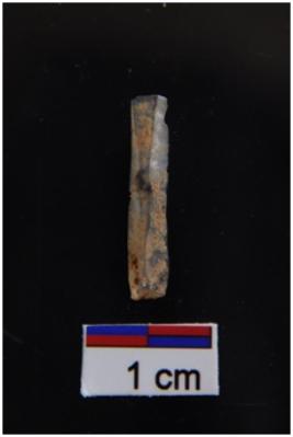 | Description / विवरण | Blade, parallel sided, prominent bulb with striking platform at proximal end, a ridge on dorsal surface, use wear marks on both edges. |