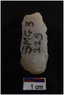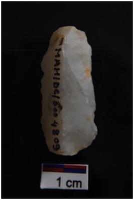 | Description / विवरण | Utilized flake, prominent bulb with striking platform at proximal end, use wear marks on both edges. |