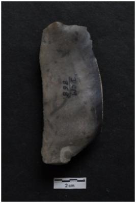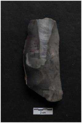 | Description / विवरण | Blade, prominent bulb with striking platform at proximal end, irregular ridges on dorsal surface, use-ware marks on both working edges. |