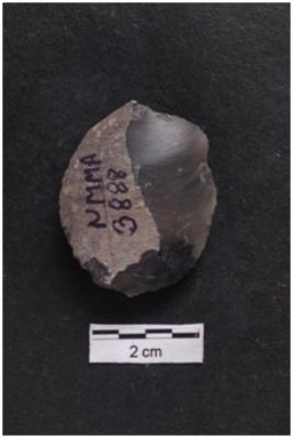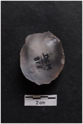 | Description / विवरण | Flake, circular shape, prominent bulb on ventral surface, cortex visible on dorsal surface. |