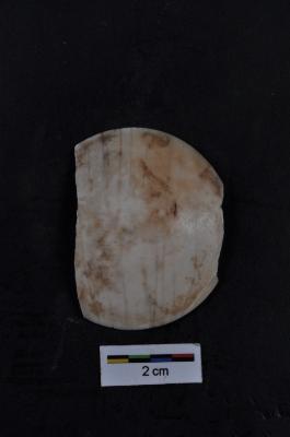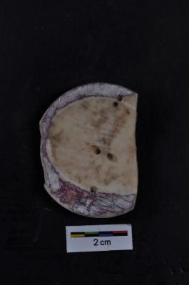 | Description / विवरण | Shell button circular in shape, 2 perforations on interior, half broken, smooth polishes surface. |