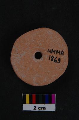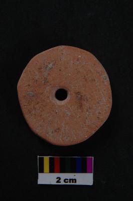 | Description / विवरण | Terracotta spindle whorl, made up of pottery disc, circular shape, with center perforation. |
