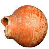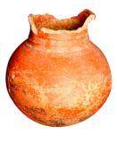 | Description / विवरण | A redware globular pot with narrow mouth, body round base, splayed out, thick turned rim, short neck, two grooves near the neck. |