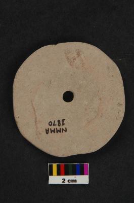 | Description / विवरण | Terracotta spindle whorl, made up of pottery disc, circular shape, with center perforation. |