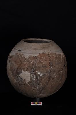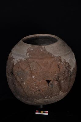 | Description / विवरण | Red ware pot with round base and appliqu design. |