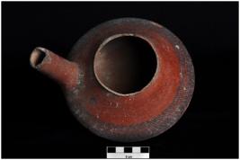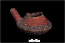 | Description / विवरण | A spouted jar with a carinated body & round bottom. The tubular spout is obliquely luted on the shoulder. It is painted on the outer surface in the form of oblique lines placed on horizontal bands. |