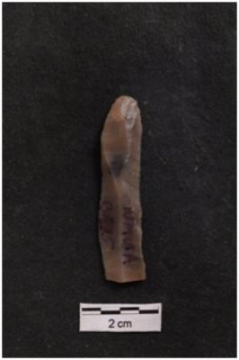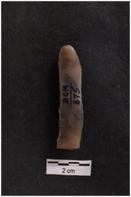 | Description / विवरण | Blade, parallel sided, prominent bulb with striking platform at proximal end, use-ware marks on both working edges, a ridge on dorsal surface. |