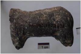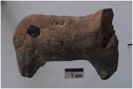 | Description / विवरण | Terracotta object of animal figurine, handmade, head is broken, appliqu tail, triangular pointed legs, red-black in colour, smooth surface, well fired, medium fabric. |