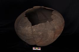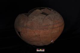 | Description / विवरण | A painted globular Red ware jar which neck portion is broken. |