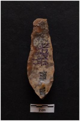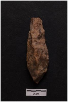 | Description / विवरण | Flake, convex working edges, a ridge on dorsal surface. |