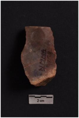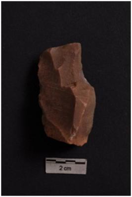 | Description / विवरण | Blade, diffused bulb with striking platform at proximal end, cortex visible on striking platform, irregular ridges on dorsal surface, use-ware marks on both working edges. |