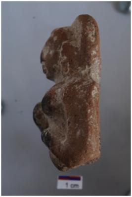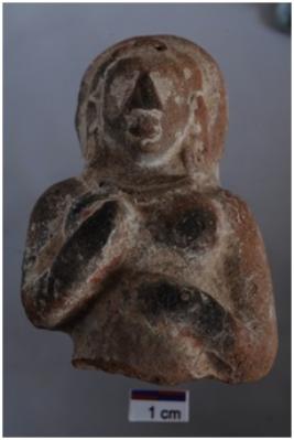 | Description / विवरण | Female figurine which is described as a mother goddess, lower part of body is broken, prominent triangular nose, prominent breast, folded hands which are closer to chest, red in colour, smooth surface, well fired, medium fabric. |