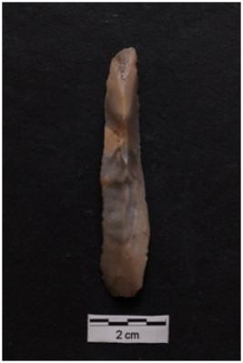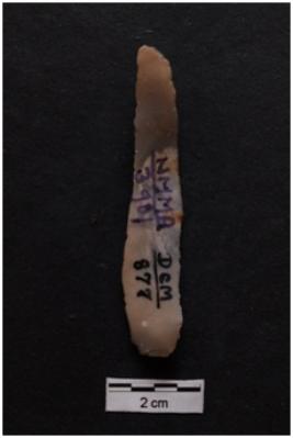 | Description / विवरण | Blade, prominent bulb with striking platform at proximal end, a ridge on dorsal surface, use-ware marks on both working edges. |