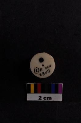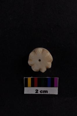 | Description / विवरण | Circular with two rings upper port made to represent ornament & a complete specimen, pure white shell, flat base eight-petalled floral design, a neat central perforation. |