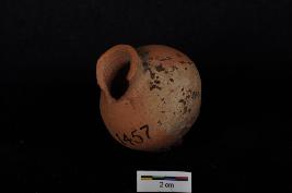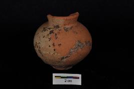 | Description / विवरण | A small size globular pot with partly broken rim and flat small base. |