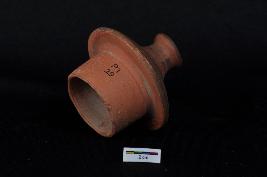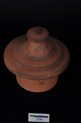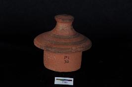 | Description / विवरण | A lid of red ware, circular with flat conical knob, painted with black circles around knob, with long stem. |