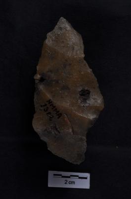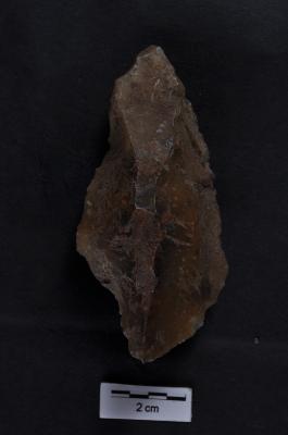 | Description / विवरण | Utilized Flake, diffused bulb on ventral surface, irregular ridge son dorsal surface, use-ware marks on both working edges. |