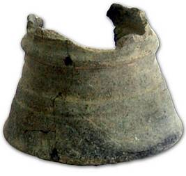 | Description / विवरण | Black ware pot with tapered shoulders. Rim and body portions are broken and missing, carinated waist and round base, deep grooves on the body, a prominent line below the damaged rim. |