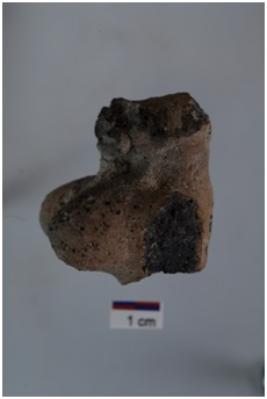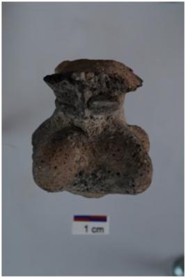 | Description / विवरण | A terracotta object of fragment of figurine, lower body below breasts broken, nose pinched up as also the eyebrow mouth indicated by an incised applique lump below nose ,back convex hand made ill backed, black ashy in colour. |