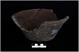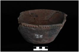 | Description / विवरण | A basin with flaring sides, flat base and a flattened rim which is decorated with cut marks on the outer margin. |