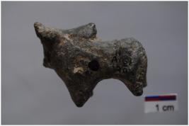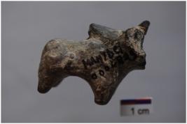 | Description / विवरण | A terracotta object of small humped bull figurine, face is broken tail absent, carved pointed horns, black in colour, handmade, well fired |