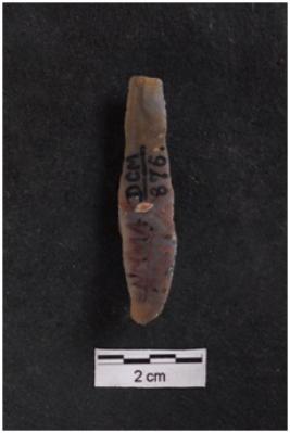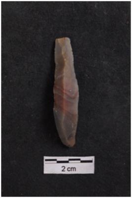 | Description / विवरण | Blade, diffused bulb with striking platform at proximal end, a ridge on dorsal surface, use-ware marks on both working edges. |