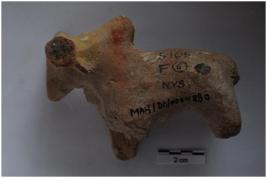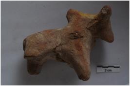 | Description / विवरण | A terracotta object of humped bull figurine, short applique tail, two legs are intact other is broken. One horn, short ears below horn. Red in coloured with red ochre & yellow pigment.Mouth is triangular, tapered in shape. |