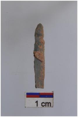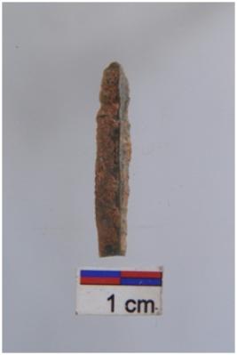| Description / विवरण | Blade, parallel sided, a ridge on dorsal surface, use-ware marks on both working edges. |