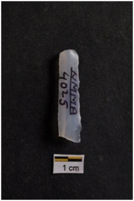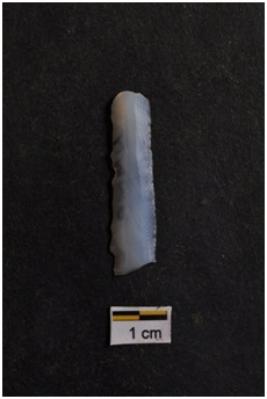 | Description / विवरण | Blade, parallel sided, prominent bulb with striking platform at proximal end, use-ware marks on both working edges. |