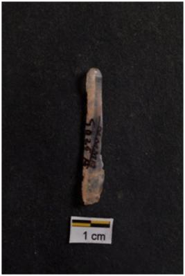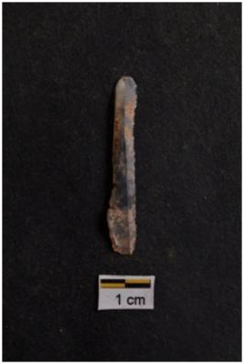 | Description / विवरण | Blade, parallel sided, prominent bulb with striking platform at proximal end, a ridge on dorsal surface, use-ware marks on both working edges. |