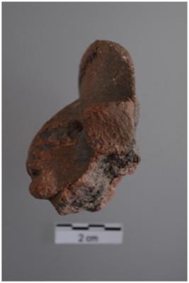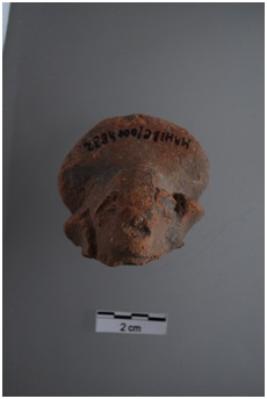 | Description / विवरण | A terracotta object figurine head is very crude, eyes shown by applique incised lumps, mouth by a short horizontal incision, big applique ears of depressed lumps, fan- shaped halo behind head. Prepared out of a single mould, traces of a red was all over. |