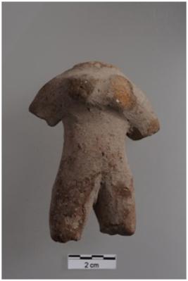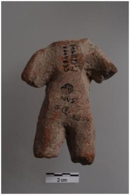 | Description / विवरण | A terracotta object of female figurine, hands are slopping down from shoulders, head is lost, legs a little apart, less stiff than the two above, back uneven hand made. Black-red in colour well fired. |