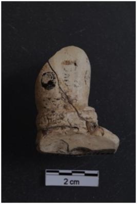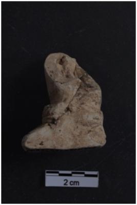 | Description / विवरण | A Kaolin object of fragment of left leg part of probably a squatting figure, prepared out of double mould, leg wearing an ornament. Figures shown by incisions flat base broken white yellow in colour. |