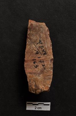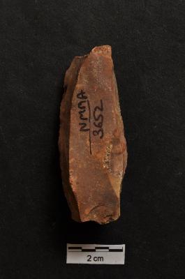 | Description / विवरण | Utilized long flake, diffused bulb with striking platform at proximal end, use-ware marks on both working edge. |