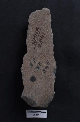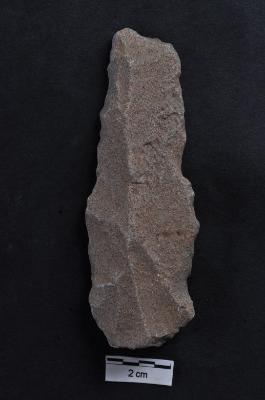 | Description / विवरण | Blade, diffused bulb with striking platform at proximal end, a vertical ridge on dorsal surface, use-ware marks on both working edges. |