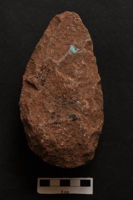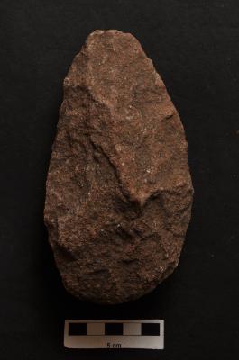 | Description / विवरण | Long pear shaped Handaxe, retouches along the periphery. |