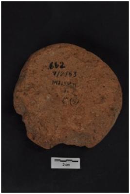 | Description / विवरण | Pottery disc, roughly circular in shape. |