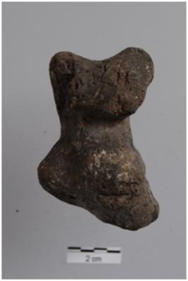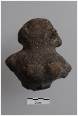 | Description / विवरण | A terracotta object of female figurine, upper half of a figurine. Featureless head, depressed navel, breast prominent , black clay mixed with lime, ill fired, black side concave handmade, black in colour, medium coarse fabric. |