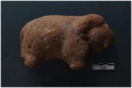 | Description / विवरण | Animal figurine, fragment trunk broken, one side flat single mould , plump belly, coarse red, traces of red slip over a white paint, well baked, rough surface. |