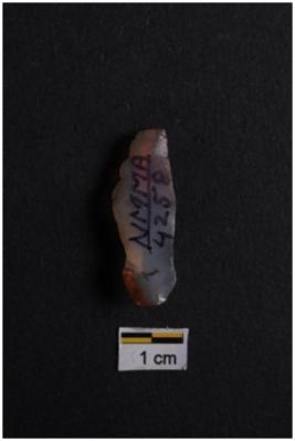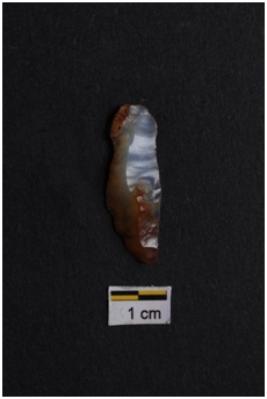 | Description / विवरण | Blade, prominent bulb with striking platform at proximal end, a ridge on dorsal surface, use-ware marks on both working edges. |