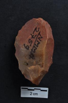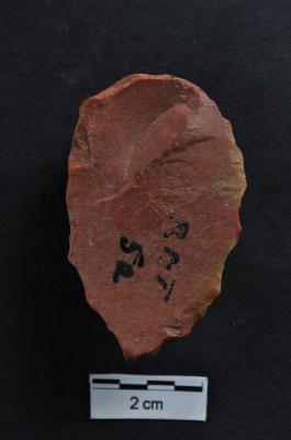 | Description / विवरण | Scraper, oval shape, diffused bulb on ventral surface, retouches on convex working edge. |
